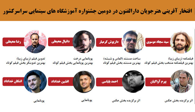به گزارش ایسنا به نقل از مرکز آموزشهای هنری و سینمایی دارالفنون، درخشش بینظیر هنرجویان آموزشگاه سینمایی دارالفنون در بخشهای مختلف این جشنواره نشان داد که این مرکز علاوه بر اینکه بهترین آموزشگاه عکاسی کشور است در سایر بخشهای آموزش سینما نیز مرکزی ممتاز به شمار می رود.