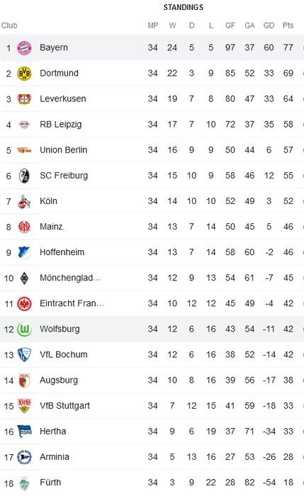 اشتوتگارت که در آستانه سقوط بود با گل دقیقه ۹۲ «واتارو اندو» کلن را مغلوب کرد و ۳۳ امتیازی شد و از سقوط نجات پیدا کرد. اما هرتابرلین که در دقیقه ۸۸ دیدار با دورتموند گل دوم را دریافت کرد و باخت، با ۳۳ امتیاز و تفاضل گل کمتر در رده شانزدهم قرار گرفت تا برای ماندن در بوندسلیگا منتظر دیدار پلیاف باشد.
